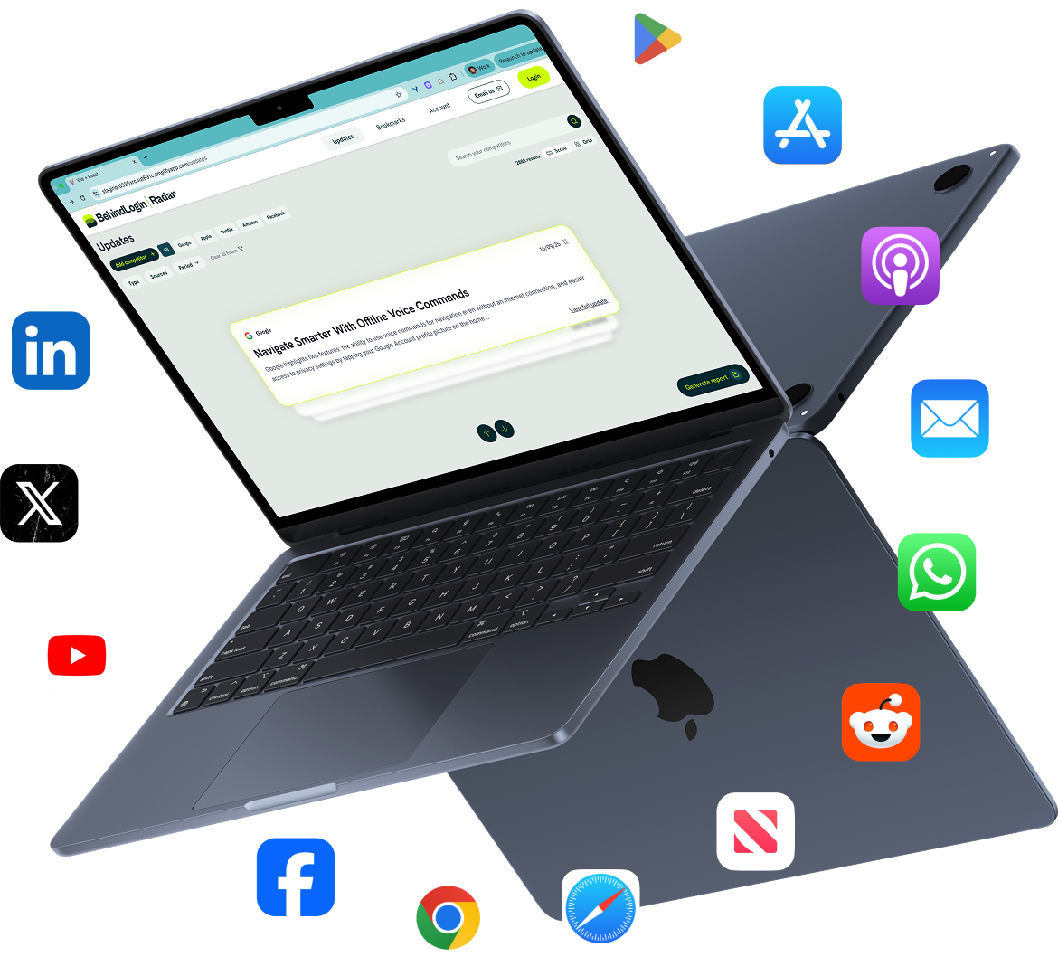- It listens continuously across competitor communication channels including app stores, social media, press releases, blog posts and marketing emails.