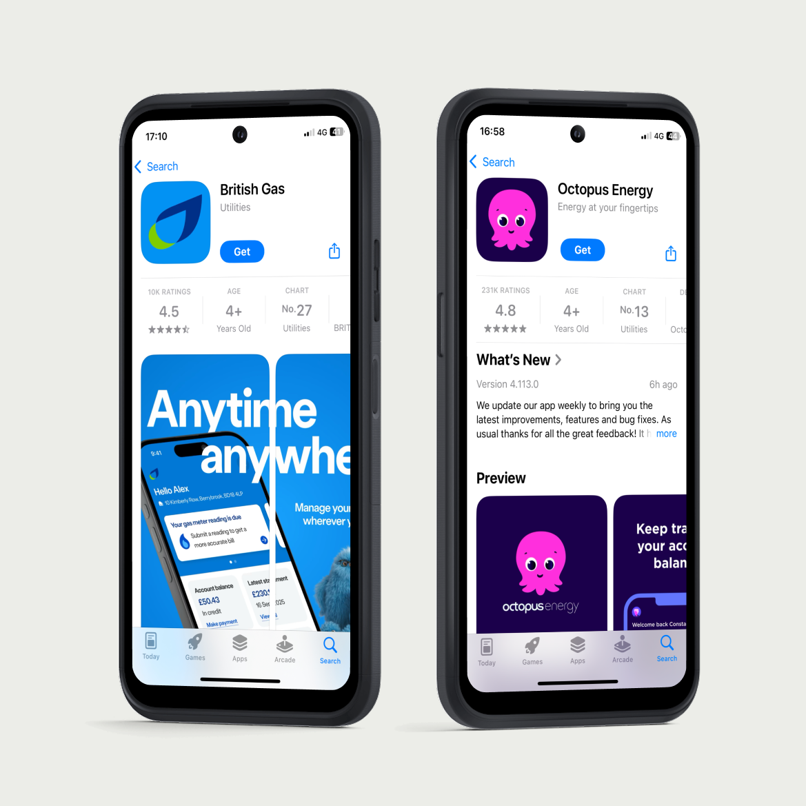 With 231k 4.8* reviews, Octopus is generally seen as the strongest pure app experience on iOS. My incumbent provider, British Gas, lags behind with 10k 4.5* reviews. Trustpilot also shows Octopus to hold a significant lead overall.