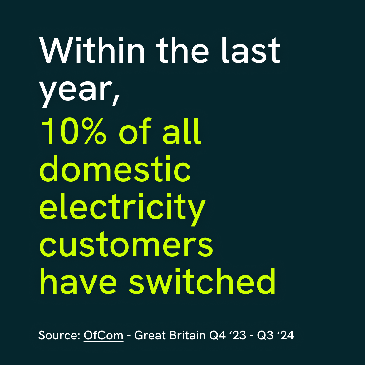 Within the last year, 10% of all domestic electricity customers have switched (OfCom – Great Britain Q4 ’23 – Q3 ’24).