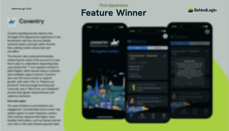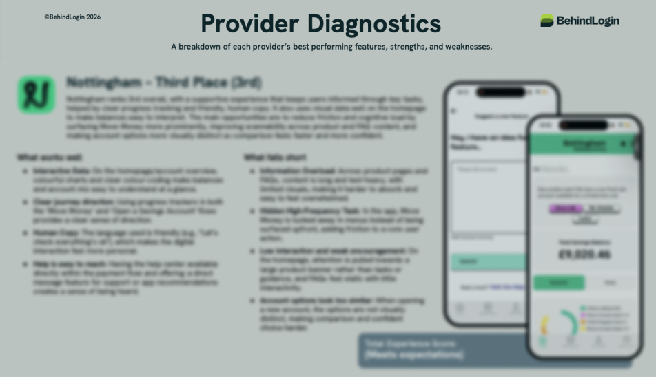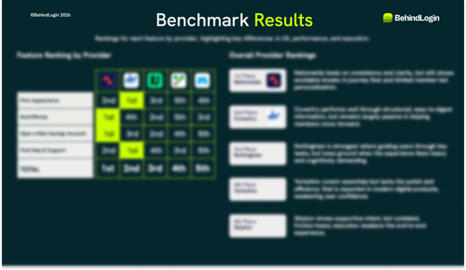 Winners have been identified for each feature. However, overall findings show that Building Society apps are operationally adequate but strategically underpowered. Within the BehindLogin benchmark, most providers support basic task completion, but few deliver the kind of experience that builds confidence, drives action and enables self-serve. The report illustrates a serious opportunity to modernise savings and mortgage experiences, remove friction, and properly integrate the member-led, human-support advantage into digital journeys.